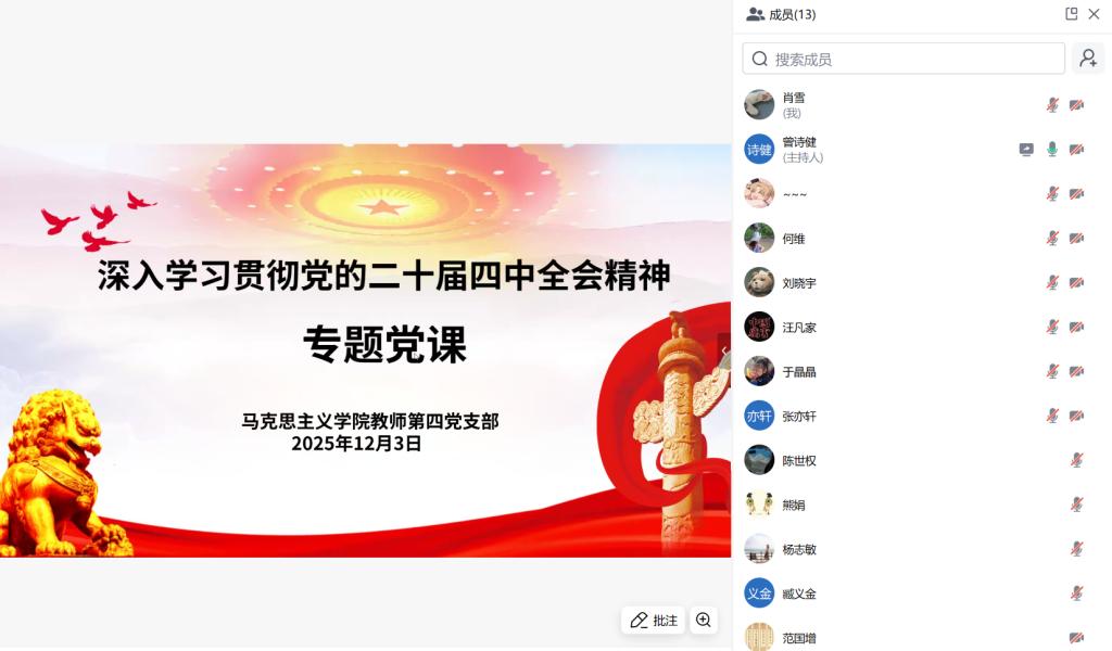 为深入学习领会党的二十届四中全会精神,切实把支部党员思想和行动统一到党中央决策部署上来,扎实推进全会精神融入思政课教学与育人实践,2025年12月3日晚,马克思主义学院教师第四党支部通过腾讯会议线上平台举办了专题党课。党支部书记曾诗健主持授课,支部党员教师参加学习。