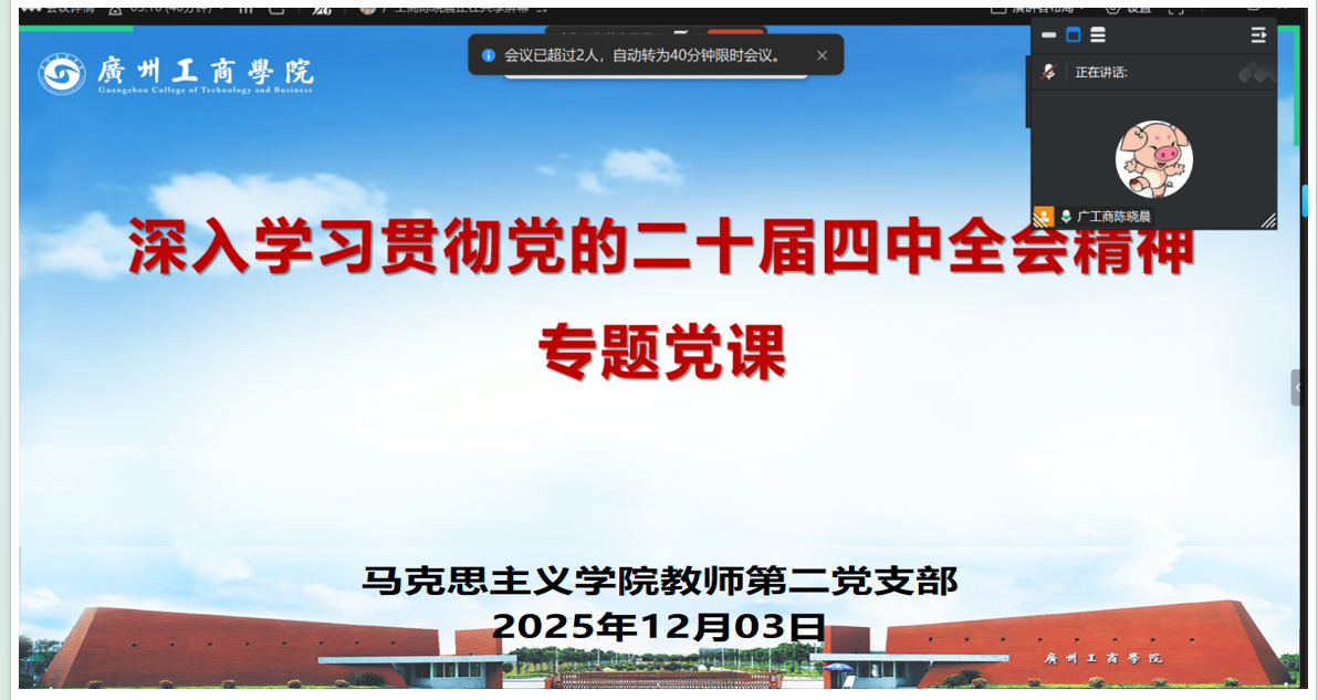 为深入学习贯彻党的二十届四中全会精神,深刻领会全会重大决策部署的核心要义与精神实质,推进全会精神“三进”工作,12月3日晚,马克思主义学院教师第二党支部在线上组织开展专题党课,围绕“深入学习贯彻党的二十届四中全会精神”集中学习。党课由党支部书记陈晓晨主讲,党支部全体党员教师参加。