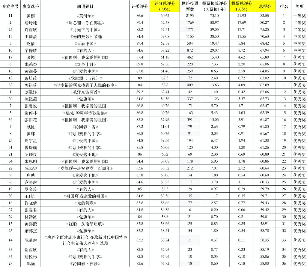 同时,由马院教师代表组成的评委团队对已入围的作品进行详细打分考评。最后,由评委团队分数的70%加上线上投票分数的30%得出最终获奖名单。一等奖获得者黄樱团队;二等奖获得者詹玲纯团队,许雨欣团队;三等奖获得者王圳清,赵倩团队,宁梓晴;其余30名参赛选手获得优秀奖。至此,本次“弘扬‘红船精神’ 诵读革命经典”线上朗诵作品征集活动圆满结束。