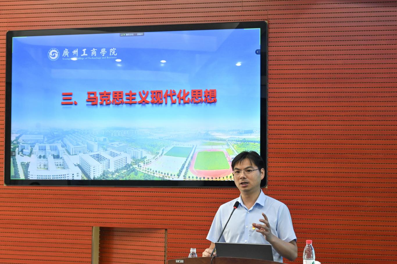 【本网讯】为深入学习习近平新时代中国特色社会主义思想,贯彻落实《广东省教育厅关于做好2022年秋季学期高校党委书记、校长和院(系)党组织书记、院长(系主任)及中小学党组织书记、校长上第一堂思政课工作的通知》文件精神和要求,9月20日下午,马克思主义学院、校团委与张辉名师工作室在三水校区办公楼322联合组织了由校长王日华教授主讲的“第一堂思政课暨马院学术论坛第二十二讲”的活动。会议由马克思主义学院常务副院长周静主持,马克思主义学院教师代表、学生代表现场聆听授课,其他师生同步收看了视频直播。