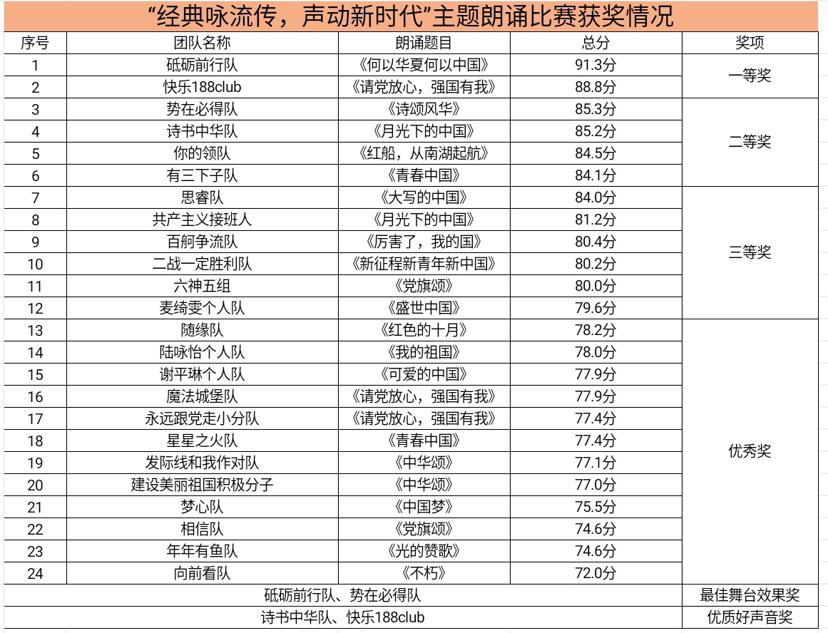 评委老师们秉持公平、公正、公开的原则,从作品的主题思想、选手的语言表达、现场感染力、舞台效果等多个方面进行评审。经过激烈的角逐评出了一、二、三等奖以及优秀奖,并根据各参赛团队在作品中展现的特色和优势,评选出“优质好声音奖”和“最佳舞台效果奖”等特别奖项。(具体获奖情况见附图)
