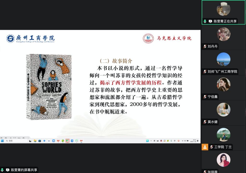 陈雯菁老师为各位学员分享的书目是《苏菲的世界》。她从作者与故事简介、主要内容分享、思想政治教育启发三个方面对这本书进行深度解读,并对如何开展好思想政治教育工作提出了几点建议:一是思想政治工作要坚持守正创新,设置悬念,坚持问题导向,创新教学方法和工作方式;二是在人工智能时代,要注重情感教育、生命教育的融入;三是引导学生学会三种“超能力”即提问力、思考力、发现力。这也为参会老师们育人工作的开展提供了有益启发。