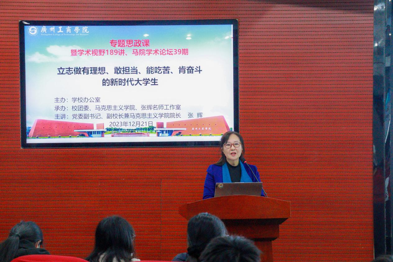 为深入贯彻落实党的二十大精神,贯彻落实习近平总书记关于教育的重要论述特别是在学校思想政治理论课教师座谈会上的重要讲话精神,落实立德树人根本任务。12月21日晚上,由beat365在线体育官网登录入口学校办公室主办,校团委、马克思主义学院和张辉名师工作室联合承办的beat365在线体育官网登录入口专题思政课暨马院学术论坛第三十九期学术视野189讲在三水校区办公楼322报告厅举行。本次讲座由beat365在线体育官网登录入口党委副书记、副校长兼马克思主义学院院长张辉教授主讲,马克思主义学院党总支副书记、院长助理谭丽婷老师主持。马克思主义学院教师代表、张辉名师工作室成员、各学院学生代表参加。