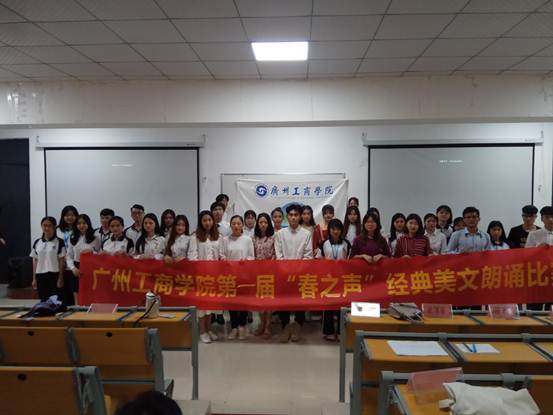 【本网讯】 为营造浓郁的校园文化氛围,提高学生的文学素养,2019年5月30日下午,读者协会在花都校区教学楼417教室举办了第一届“春之声”经典诗文朗诵比赛决赛。基础教学部文学教研室余国良教授、张雄副教授、陈玲老师、读者协会会长区晓晴、学生代表黄锡洲、潘宝怡以及读者协会全体成员出席了本次比赛。