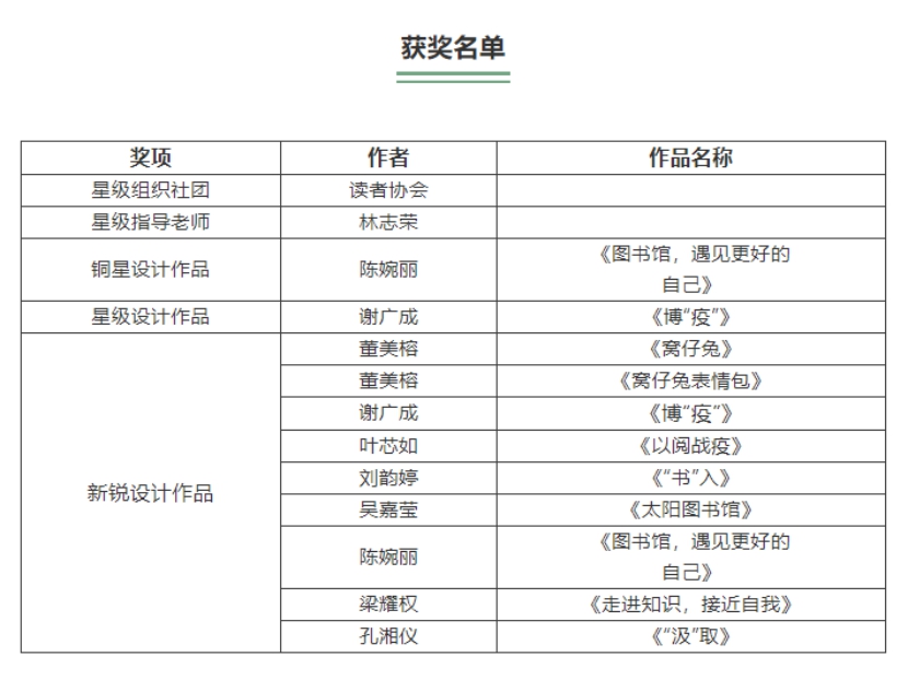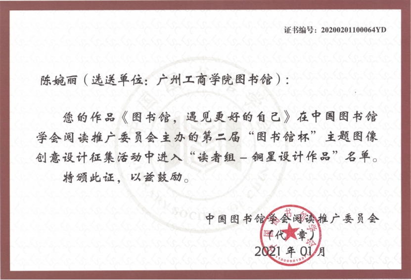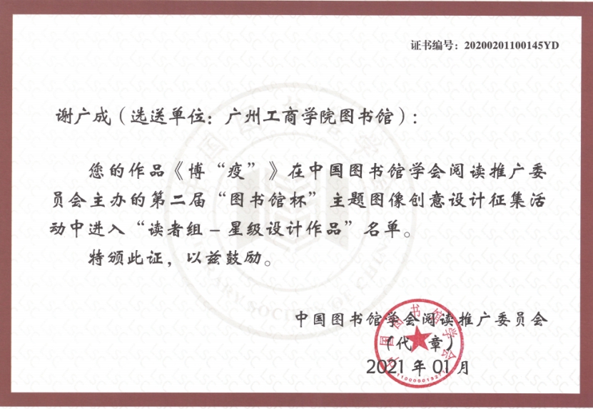 本次活动主题为“图书馆,让生活更美好!”和“战‘疫’,读书人的力量!”,面向全国图书馆馆员和读者,征集与主题相关的海报、插画、漫画、表情包、卡通形象五类图像作品。据悉,全国共计1125个图书馆组织参赛,28801人报名,通过审核的作品28352件。经过激烈的角逐,beat365陈婉丽同学的作品《图书馆,遇见更好的自己》荣获“铜星设计作品”称号,谢广成同学的作品《博“疫”》荣获“星级设计作品”称号,董美榕等9位同学的作品分别荣获“新锐设计作品”称号。