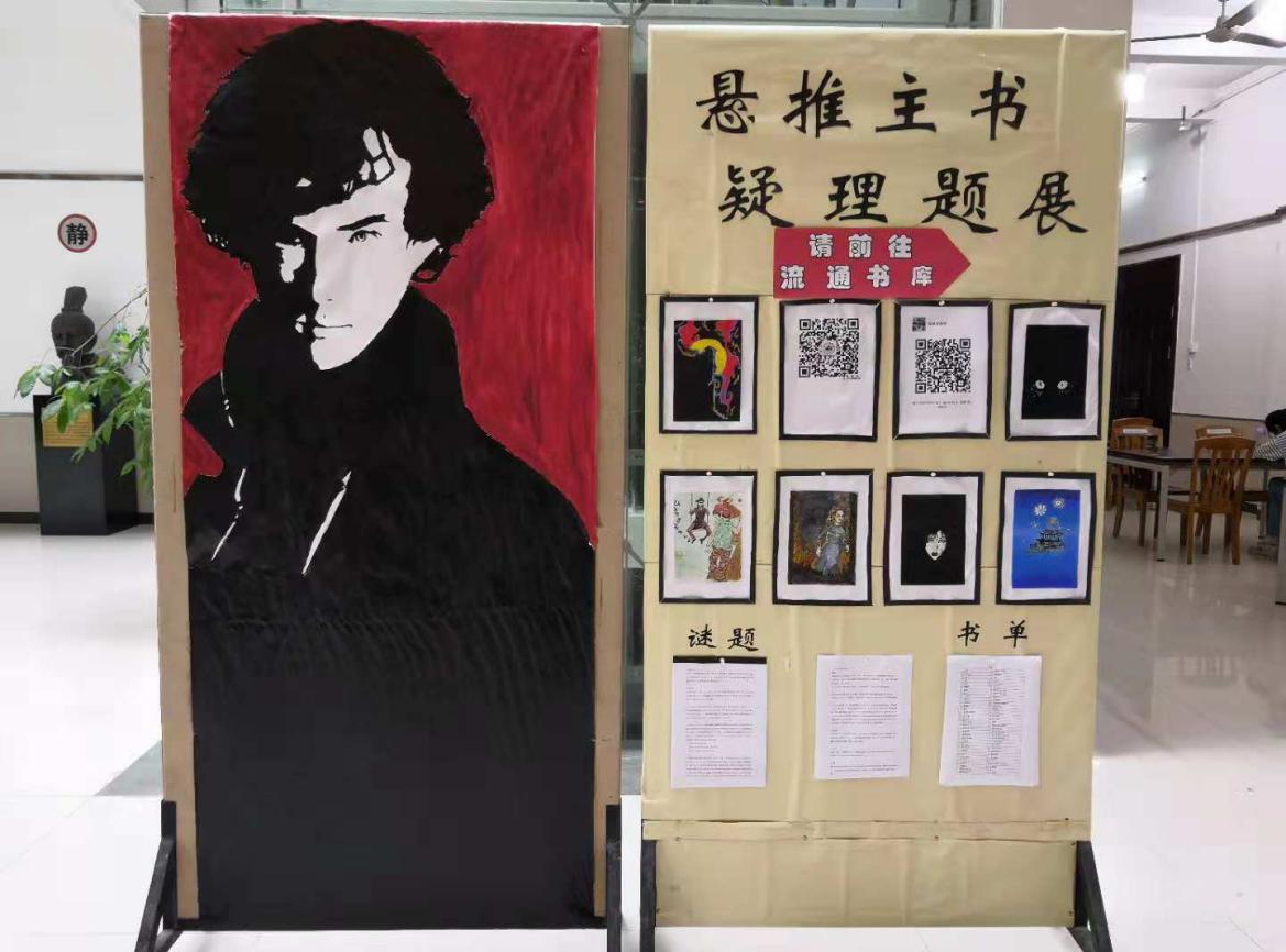 本次主题书展以悬疑推理为主题,通过在图书馆大厅内放置手绘海报告知全院师生有关活动信息,并设置路标指引师生们凭借借书证进入流通书库中的书展区进行自由取阅。此外,还搜集了大量的推理谜题供大家解谜,锻炼推理能力,并组建了微信书友群,师生们可通过扫描手绘海报上的书友群二维码进入群聊,与书友们一同探讨读书心得。