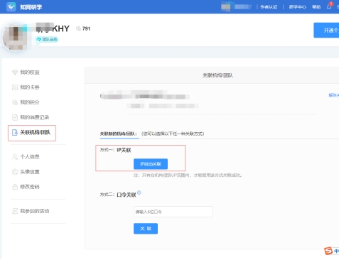 3、登录个人账号后,在研学平台点击右上角“头像”进入“个人中心”,选择“关联机构团队”,选择方式一“IP自动关联”,即可正常使用。