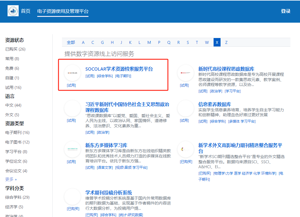 访问方式:进入图书馆电子资源模块,选择SOCOLAR学术资源检索服务平台,即可正常使用。