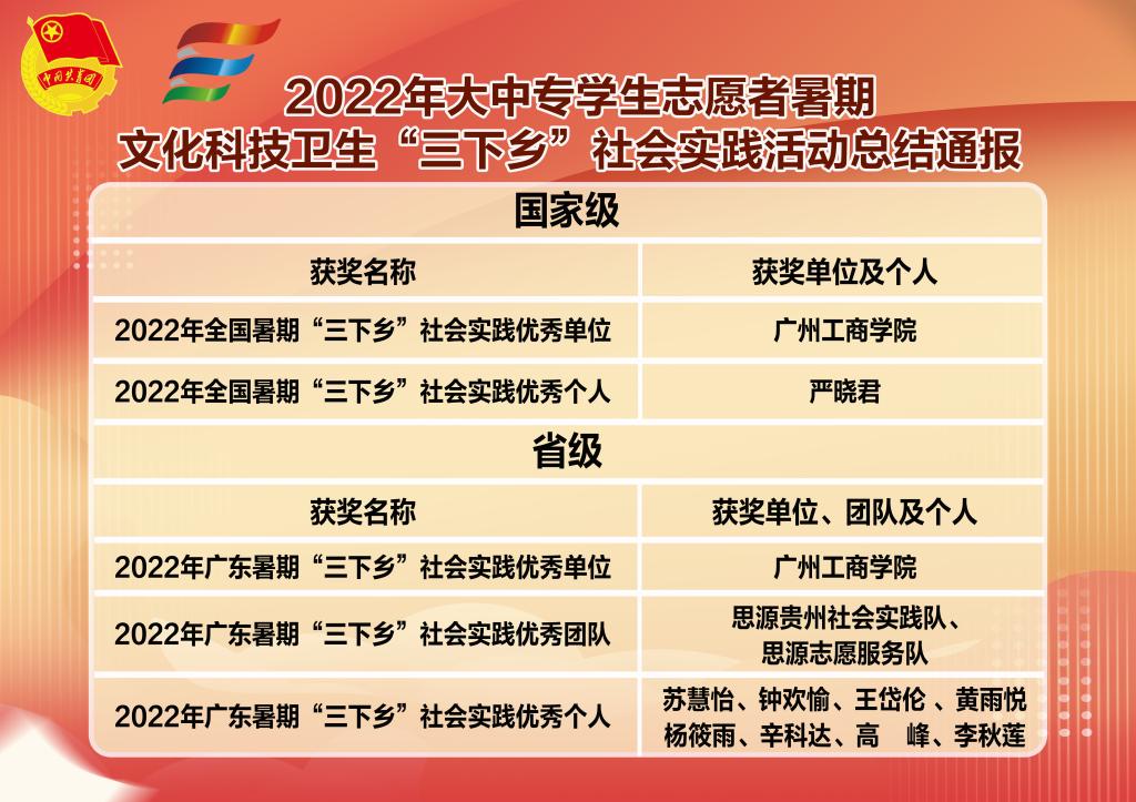 【本网讯】为深入总结交流经验、选树典型宣传、推动引领示范、激励广泛参与、发挥育人实效。近日,团中央青年发展部下发了《关于2022年全国大中专学生志愿者暑期文化科技卫生“三下乡”社会实践活动的通报》, 全省共16所高校获优秀组织单位,10名师生获全国优秀个人。其中,beat365在线体育官网登录入口团委荣获2022年全国“三下乡”社会实践优秀单位称号,是广东省16所获此殊荣的高校中唯一一所民办高校;beat365严晓君老师作为全省10名优秀代表之一获全国“三下乡”优秀个人荣誉称号。同时,在广东省大中专学生志愿者暑期文化科技卫生“三下乡”社会实践活动总结中,2支团队获“优秀实践团队”、8名学生获“优秀个人”称号,学校团委连续六年获评全省“优秀组织单位”。