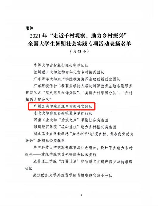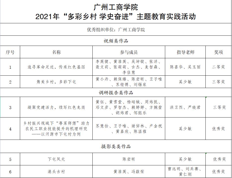 此外,在全国大学生暑期社会实践专项活动中,思源志愿服务队被团中央评为”优秀团队”,同时在中国光华科技基金会的“乡村振兴幸福行动”中,荣膺“乡村振兴十佳团队”的称号;在2021年广东大中专学生志愿者暑期文化科技卫生“三下乡”社会实践活动中,思源志愿服务队和“青萌公益”2支团队获评省社会实践“优秀团队”,严晓君、黄雪莹、陈秋燕、方婉莹、江明坤、赖婷婷、谢汶彤、范露丝共8名师生获“优秀个人”;在2021年“多彩乡村 学史奋进”主题教育实践活动中,共有6个作品斩获佳绩,其中《追寻革命足迹,传承红色基因》视频作品荣获视频类“二等奖”,《隽美乡村,多彩下屯》视频作品获视频类“三等奖”,《凝聚党建活力,续写红色龙岗》调研报告作品获调研报告类“三等奖”。