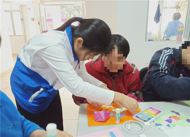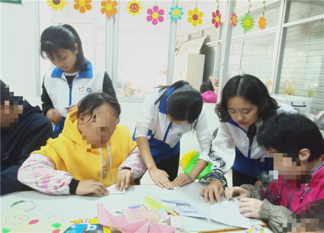 活动于下午14:00正式开始,志愿者们进行自我介绍后,给每位康园宝宝分发精心准备的水果,同时与他们进行亲切的沟通,还教他们如何进行手工制作剪纸贴画,志愿者们与康园宝宝一同绘出各自色彩斑斓的内心世界。