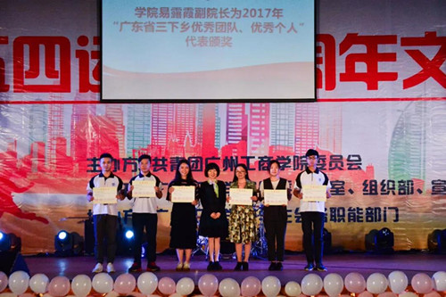 学院党委组织部部长陈豫岚为文艺汇演暨学生获奖表彰大会致辞,她号召全院团学干部、青年团员在团省委“灯塔工程”的指引下打造思想引领的品牌项目,勇做时代弄潮儿。期间,三轮颁奖环节依次进行,学院易露霞副院长为荣获2017年广东省大中专学生志愿者暑假文化科技卫生“三下乡”社会实践活动优秀团队及个人颁奖,学院党委组织部部长陈豫岚为2018年广东省“挑战杯-创青春”创业大赛校内选拔赛一等奖获奖团队颁奖,学院团委洪卫烈书记为院团委学生会2017-2018年学年院团委学生会星级干事颁奖。
