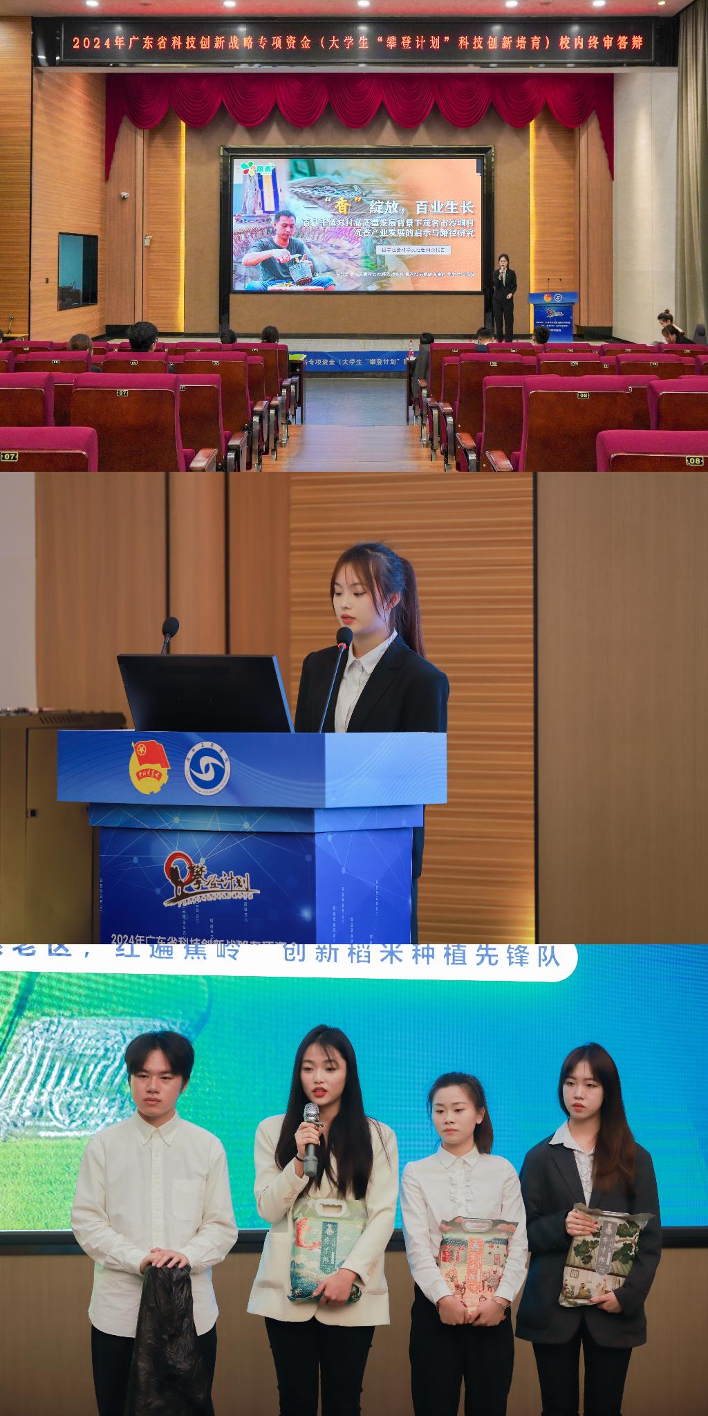 同时,校团委洪卫烈书记从前期安排、项目申报、相关工作落实等情况作2024年广东省科技创新战略专项资金校内终审决赛工作报告;学生代表22级跨境电子商务B1班王烨婷分享项目经验。