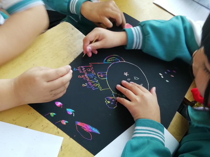 课堂上,志愿者们带领小朋友们遨游于星际,让小朋友们对小星球有所了解。志愿者们还通过扮演小王子、地理学家、商人等角色,让小朋友们找出他们所居住的星球是什么样子的。随后志愿者们让小朋友们在纸上画下自己想象的小星球。小朋友们神情专注地在画纸上描描点点,各色各样的小星际呈现在纸上。
