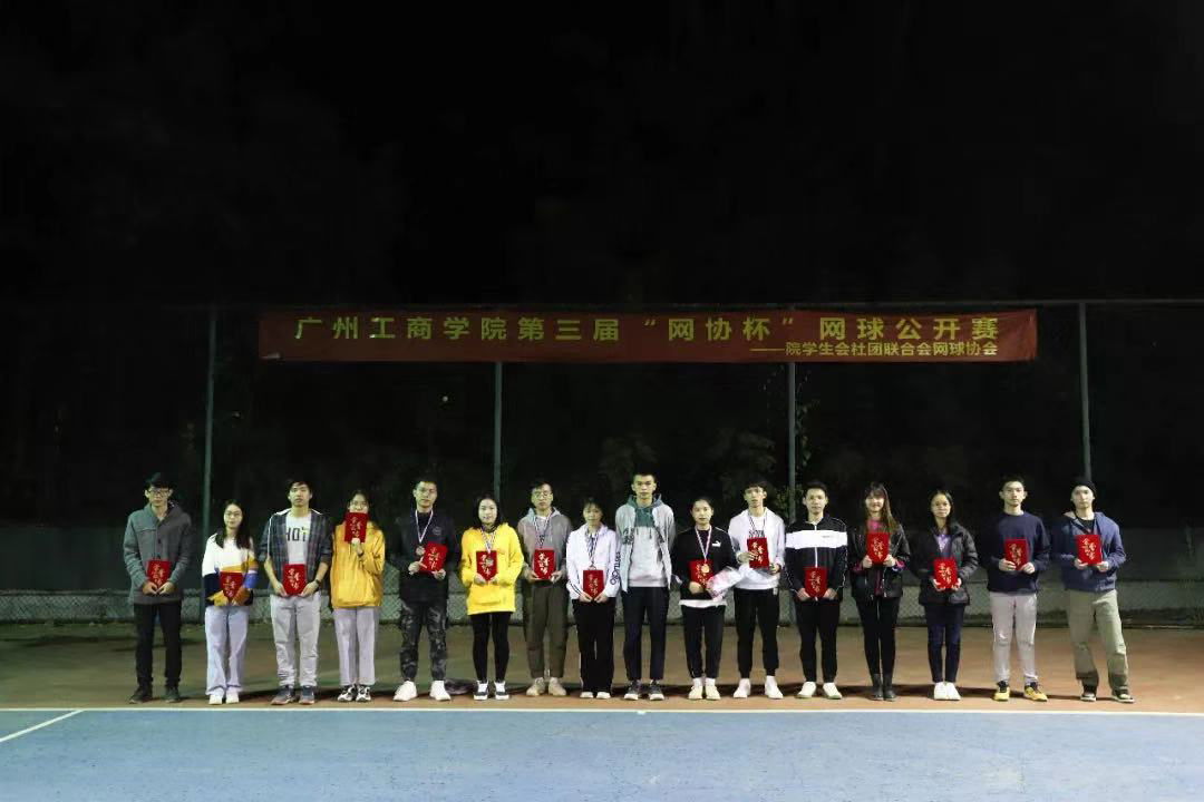 【本网讯】12月5日晚上,第三届“网协杯”网球公开赛闭幕式暨颁奖仪式于我院花都校区网球场顺利举行。院学生会社团联合会理事长廖哲灏、院学生会社团联合会网球协会会长巫宇焕、16级学生代表陈志光、17级学生代表陈嘉雪以嘉宾身份出席了本次颁奖仪式。