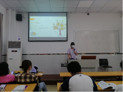 心理委员董倩瑜同学通过英国喜剧泰斗饰演的憨豆先生以及开心麻花的马丽都曾经患过抑郁症事件,带领同学们学习并了解如何辨别抑郁症、抑郁症的临床表现、对人的影响以及我们该如何预防抑郁症。最后她指出,不论怎么样,我们都应该正确对待抑郁症,并以乐观的心态面对生活和学习。