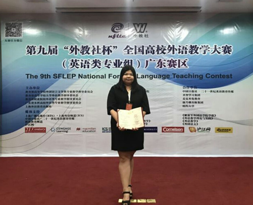 10月27日,广东省2018年本科院校外语教学大赛暨第九届“外教社杯”全国高校外语教学大赛(广东赛区)决赛在广州落下帷幕,外语系首次受广东省外语专业教学指导委员会邀请,选派唐婧、陈思云老师参加此次比赛。复赛中,两位老师在全省四十多所本科院校的参赛选手中脱颖而出,双双进入决赛。经过决赛的激烈角逐,唐婧老师获得商务英语专业组“二等奖”,陈思云老师获得英语组“三等奖”。