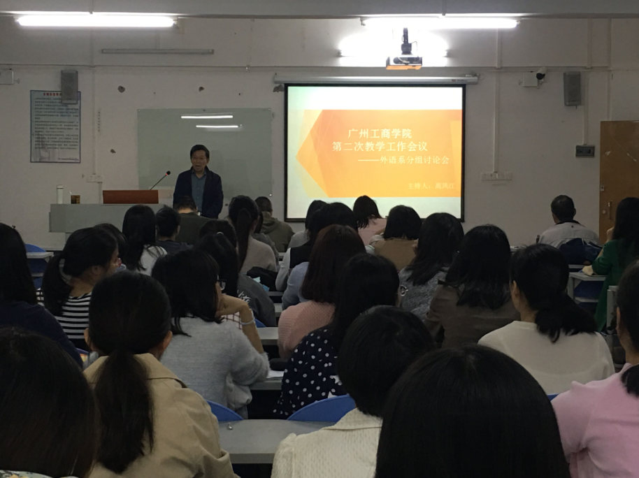 会议开始,高主任进行主旨发言,传达本次会议精神,布置本次会议进程安排。接着,各位老师分组进行讨论,15分钟后,各教研室选派代表,主要围绕基于2020年本科教学工作合格评估的要求,我系专业建设方面的突出成果以及存在问题,和基于广工商振兴本科教育实施方案,外语系如何找差距、补短板这两个主题进行发言。