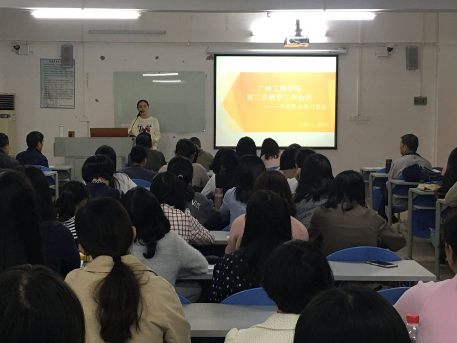 首先,商务英语(本科)教研室代表杨嘉仪发言,主要从专业建设与人才培养、师资队伍建设、教学改革等几方面总结了我系专业建设取得的成绩。我系教师不断深化课堂教学改革,积极尝试和推进雨课堂、微助教等信息化教学实践。教师间积极参与听课评议,以公开课等多种形式进行相互交流,同时积极参加学院举办的教师课堂教学能力提升等专题培训,参加教学竞赛、多媒体课件评比等竞赛活动,进一步规范了教师的课堂教学管理与能力。教师在申报教学科研等项目与课题上均取得了极大的进步。10月27日第九届“外教社杯”全国高校外语教学大赛中表现突出,唐靖和陈思云老师分别荣获广东赛区商务英语组和英语专业组的二等奖和三等奖。通过不断更新教育观念和知识结构,教师们提高理论素养、教研水平和实践能力。接着,她讲述了我系亟待解决的问题:1.在专业英语四级以及商务英语专业英语四级考试筹备工作中,加大对学生的培训指导力度,提高学生通过率;2.在专业实践实训课环节上,我们还存在薄弱的地方,比如在外贸实务、商务谈判、跨境电商等模拟仿真教学环境中,设备或操作平台配备不足,我们系还没有专门的用于商务谈判和跨境电商课程的商务情景模拟实验实训室;3.有企业工作经历的高素质人才和双师型教师的比例有待提高。