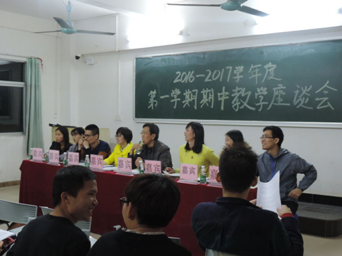 2016年12月6日晚上19:00-21:20,外语系2016—2017学年度第一学期期中教学座谈会在外语楼504召开。本次会议由外语系学工组组长罗美娥老师主持,出席本次座谈会的嘉宾有外语系主任高凤江教授,外语系辅导员黄海宁老师、蒋慧娟老师、陈玲老师、彭彩老师、肖景仁老师、苏伟豪老师,以及外语系15级、16级各班学生代表。座谈会上,学生代表们各抒己见,畅所欲言。他们根据前期收集的学生意见,分别对班级科任老师作出了意见和建议,并对学校教学设备设施方面提出了诉求。对于教学课程的安排,各班代表们希望学校能够增设更多与商务英语、日语相关的专业课程,以及与各种考证相关的讲座,并开设第二外语学习课程等等。此外,学生们反映学校图书馆关于学习商务英语、日语的图文资源匮乏,且不能与时俱进,同时教学设备的落后严重影响了课堂教学质量。