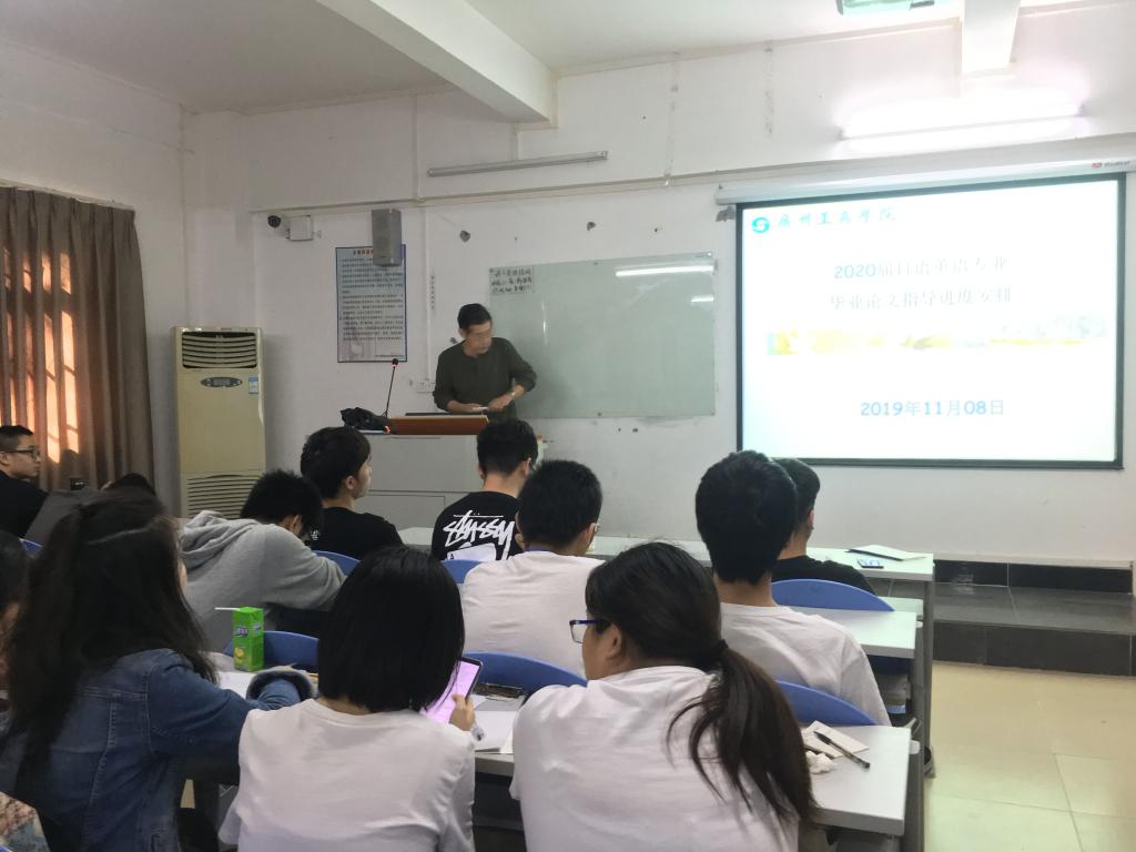 本次大会由外语系教学秘书申卫红老师主持。申老师详细介绍了此次大会的主要内容、大会的目的和意义。会上,陈光教授围绕选题要求、开题报告、文献综述这三个方面进行了讲解,并提出了毕业论文的质量标准,强调了论文写作的重要性与注意事项,明确本学期要完成的毕业论文(设计)阶段性工作,使同学们充分了解论文流程与所需提交的材料。