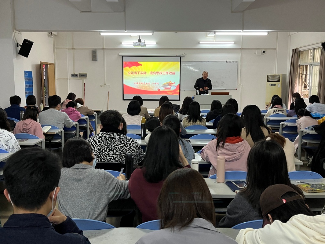 3月25日下午15:40分,外语学院党总支常务副书记习传进教授为本院教职员工开讲“思政第一课”:立足当下实际,提高思政工作效益。