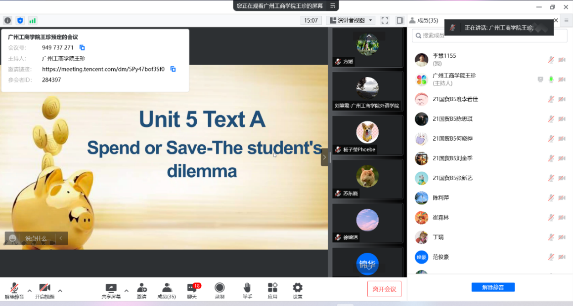示范课主讲教师王珍是大学英语教研室的专任教师,具有丰富的教学经验,曾多次获得学院“优秀教职工”称号,深受学生喜爱。因考虑到疫情防护,示范课以线上的形式开展。王珍老师选取《大学英语II》课程的《新视野大学英语读写教程》第二册第五单元Text A进行示范授课,该单元课文主题是平衡消费与储蓄。王珍老师准备充分,对示范课的教学环节进行精心设计,从教学内容、教学目标、教学回顾、课文导入、段落内容讲解分析、小组讨论活动以及作业布置等方面,完整地呈现了示范课的流程。示范课利用生动形象的视频及学习通网络教学平台,充分调动学生参与课堂的积极性。示范课最大的亮点是课程思政元素的融入及充分体现,王珍老师通过课堂教学,除了让学生充分理解课文内容,同时加强学生的中国传统价值观,引导学生树立正确的消费观。