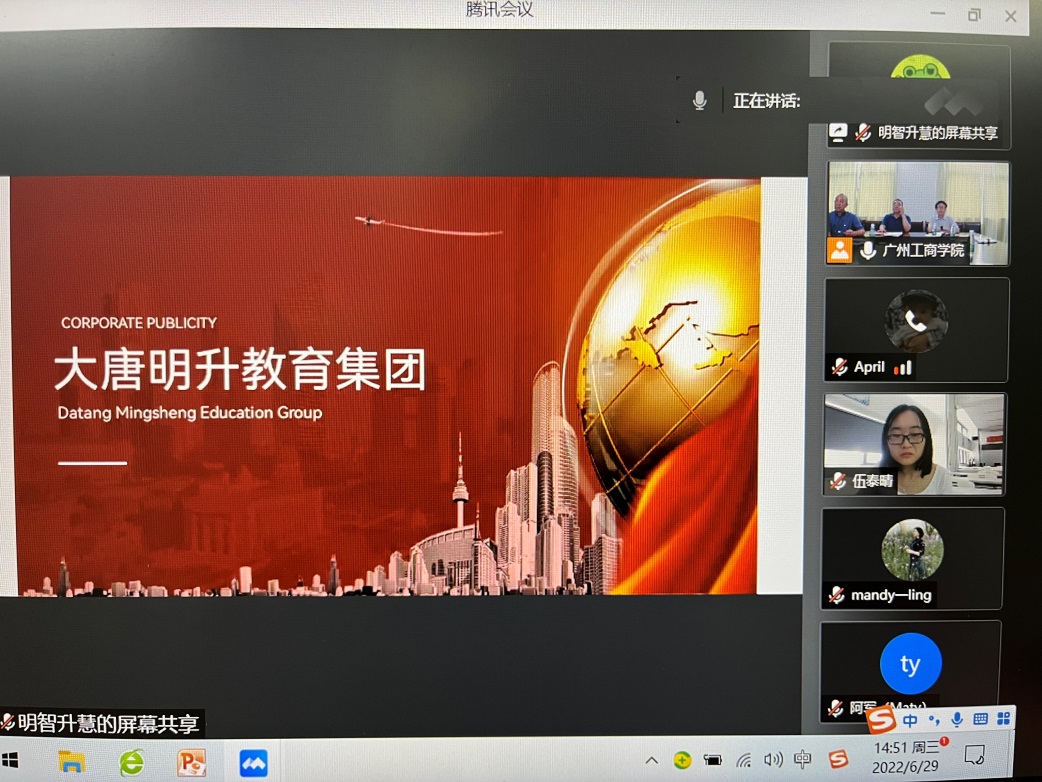 “大唐明升”唐后元董事长表示希望通过与外语学院合作,真正达到产教融合。从外语学院向其他学院向外扩,并涉及劳动技能课等深度和其他专业进行进一步的合作,也希望学校领导多到企业来考察指导,洽谈更深入的产教融合的深度合作。