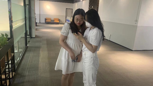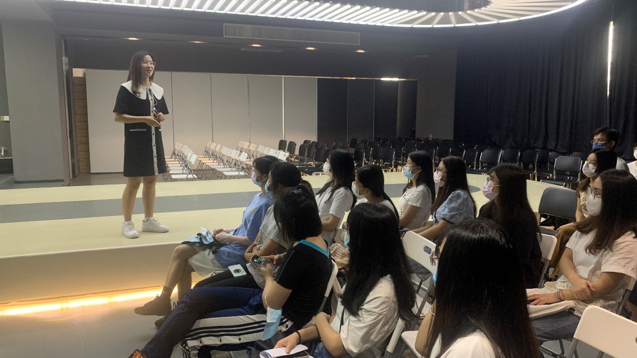 指导老师们先带着学生们参观了办公区,公司里的员工以销售小组为单位办公,每个小组有着不同的月销售目标。一进入办公区,映入眼帘的就是挂在每个办公桌上的一面面有着不同标志的旗帜,旗帜上的图案象征着员工的业务能力,让同学们深刻感受到职场工作环境中的激烈比拼。在此,指导老师还向同学们详细介绍了公司的用人制度和福利。随后同学们参观了该公司产品——假发展厅和直播间,指导老师简单介绍了假发的收购到独家制造的一系列流程。咖呗乐假发品类丰富齐全,形成以“辫子发”为中心的一超多强的核心优势,主要是咖呗乐假发制品原料和制发技术的不断突破,从优质原料的极度精挑细选到精细制作,制发八大工艺的每一步都是多年以来的技术沉淀。