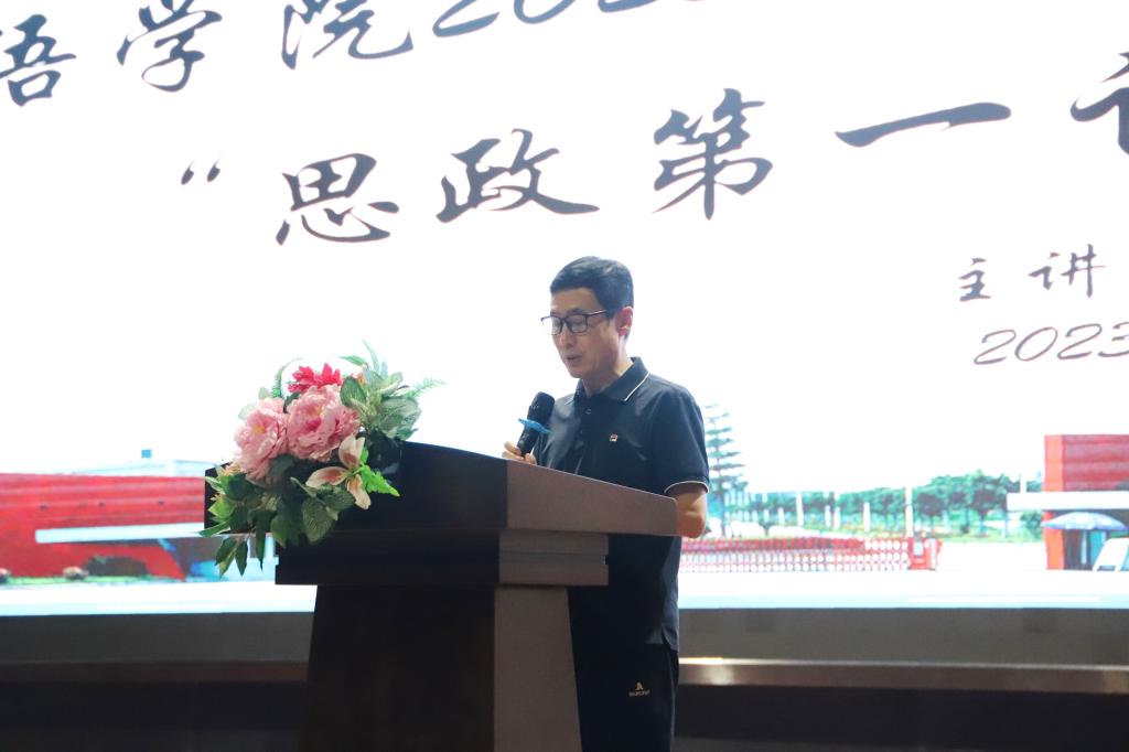 主持人宣布活动正式开始后,全体师生起立奏唱了中华人民共和国国歌。由外语学院党委书记、院长刘沛富教授为全体新生讲思政第一课,刘院长主要向同学们介绍了外语学院的发展历史及过程。以及商务英语专业和日语专业的基本概况。他希望同学们能够在新环境中实现新成长,珍惜在外语学院的宝贵时光,努力学习专业知识,主动学习、自主探索,保持好奇心。释放想象力和创造力,在生活和学习中融会贯通。用行动彰显青年风范,为自己的未来奠定基础,做勇于面对未知的探索者和求知者。