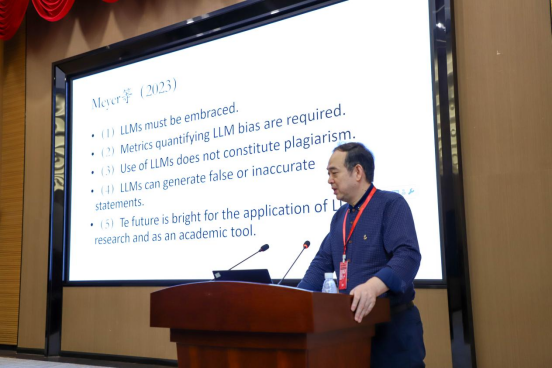 大会主题发言第二环节,大连外国语大学于飞教授以“数字技术背景下外语教学的几点思考”为题,强调数字技术对外语教育的积极影响。北京第二外国语学院杨玲教授以“数字化转型语境下的翻译教学思考”为题,探讨翻译教学在数字时代遇到的挑战和机遇。南开大学韩立红教授以“混合式教学模式下的日本文化概论课程教学”为题,分享线上线下混合式课程建设的成功案例。中山大学张兴教授以“ChatGPT和日语教学与研究”为题,介绍ChatGPT在语言研究与教学中的创新应用。这一系列发言紧扣数字技术与日语教学,为与会者提供了丰富而深刻的思考与启示。