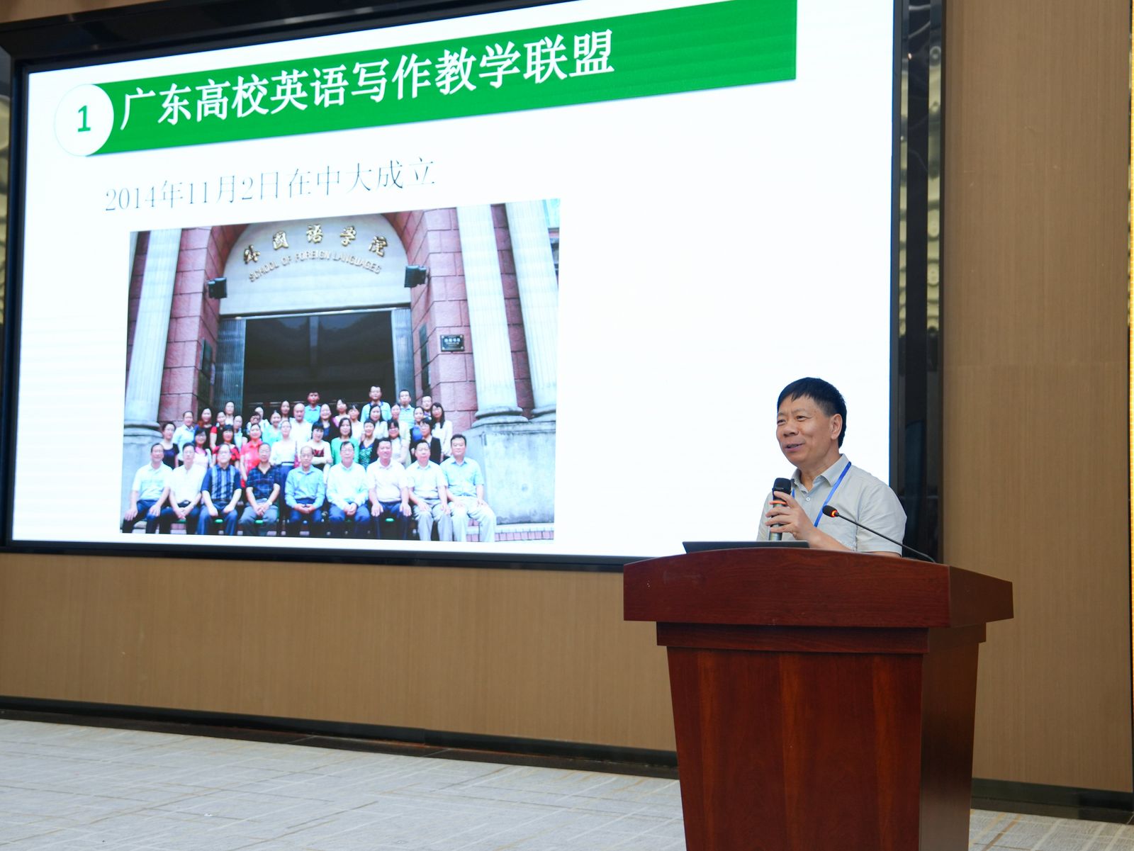中国高校英语写作教学联盟发起人之一、中山大学王哲教授作题为《大学外语教学创新联盟:从构想到实践》主旨报告,介绍了大学外语教学创新联盟的“三大目标”和“四大服务”,通过举办“联盟杯”英语写作大赛、讲好中国故事新闻英语大赛,将思政元素融入英语教学中,深入推动党的二十大精神进课堂、进头脑、进研究、出成效。