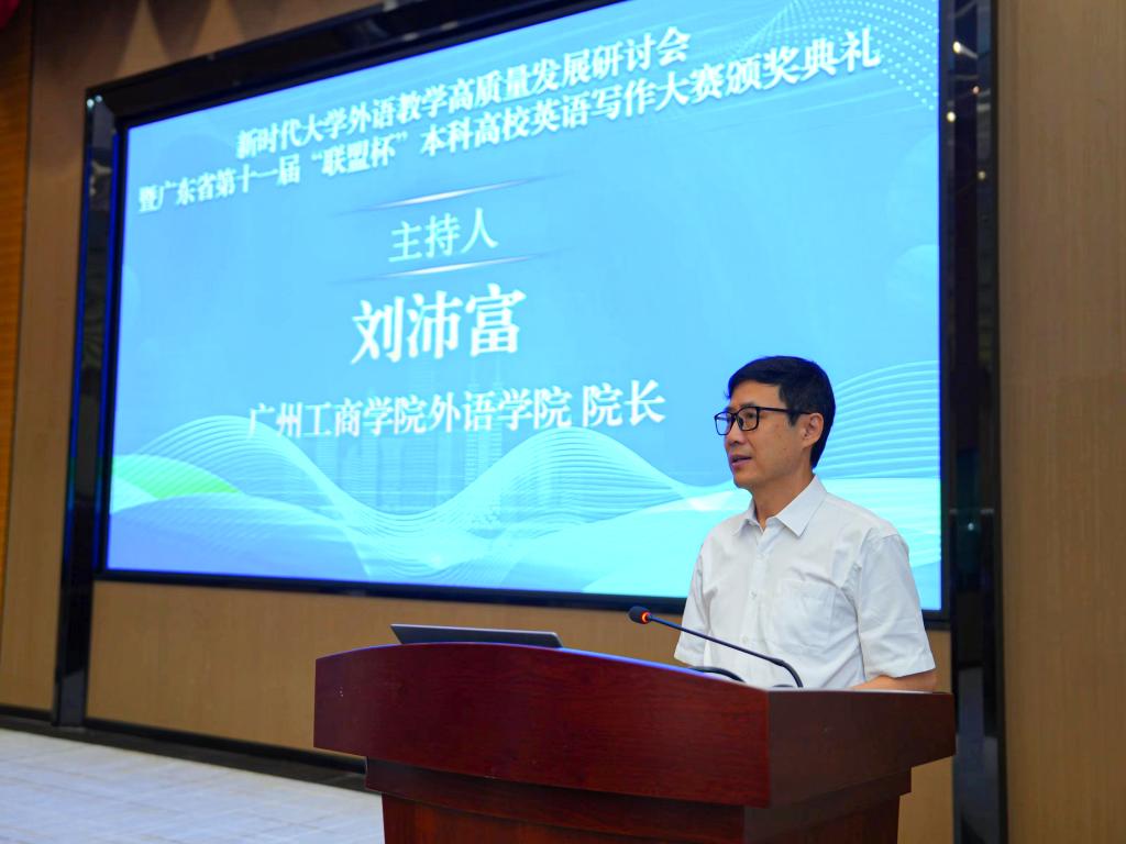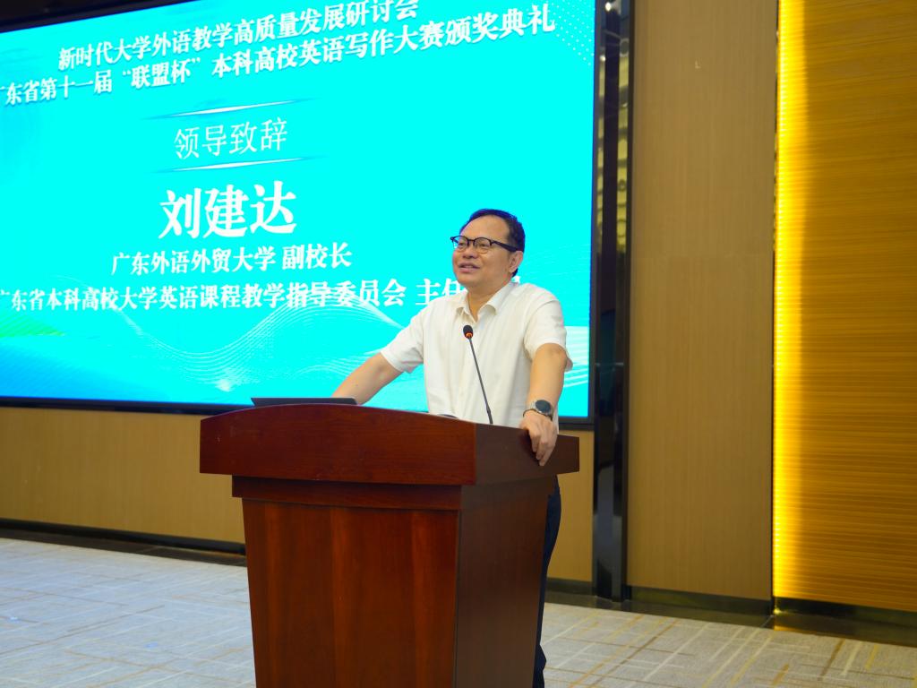 教育部高等学校大学外语教学指导委员会副主任委员,广东外语外贸大学副校长刘建达教授随后致辞。他首先向承办、协办此次研讨会的学校及单位表示衷心的感谢。他指出,随着科技的不断进步和创新,新质生产力在外语教育中的应用正改变着传统的教育模式,大学外语教育者要深入学习领会习近平总书记关于发展新质生产力的重要论述精神,扎实做好教育改革、科技创新、人才培养工作,实现教学高质量发展。