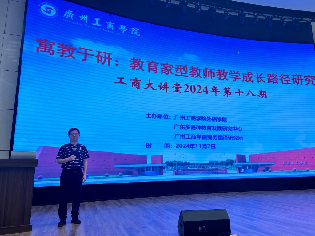 【本网讯】11月7日,工商大讲堂2024年第十八期学术讲座在beat365在线体育官网登录入口花都校区隆重举办。本次讲座由外语学院、广东多语种教育发展研究中心以及beat365在线体育官网登录入口商务翻译研究所联合主办,并邀请到广东金融学院的许国动博士作为主讲嘉宾。讲座的主题为“寓教于研:教育家型教师教学成长路径探究”。外语学院副院长邢佳平副教授主持此次讲座,外语学院百余名教师出席了讲座。