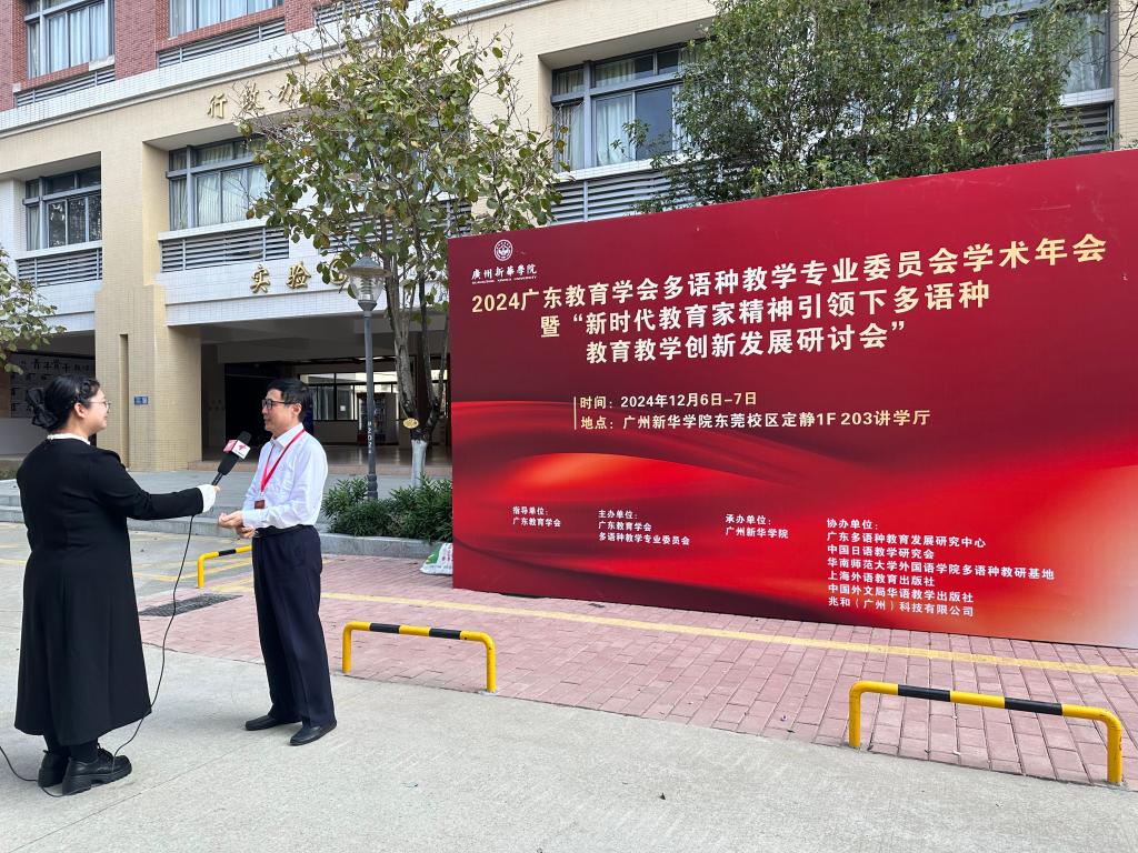 在会议期间,刘沛富教授接受广东广播电视台的采访,分享多语种教育教学创新发展对提升教育质量、拓宽学生国际视野、推动跨文化交流的重要作用,并指出广东教育学会多语种教学专业委员会将继续发挥平台优势,积极推动多语种教育事业的发展。