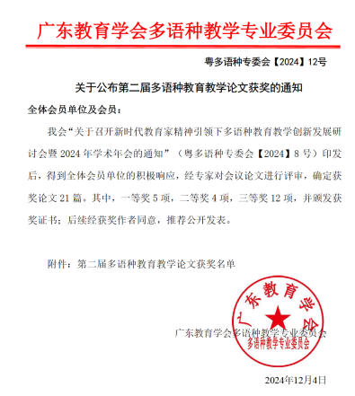 2024年12月4日,由广东教学学会多语种教学专委会主办的第二届多语种教育教学论文评选结果揭晓。经过专家严格评审,共评选出21篇来自基础教育和高等教育领域的优秀论文。在此次评选中,我院4位教师表现突出,荣获一等奖1项、三等奖3项。