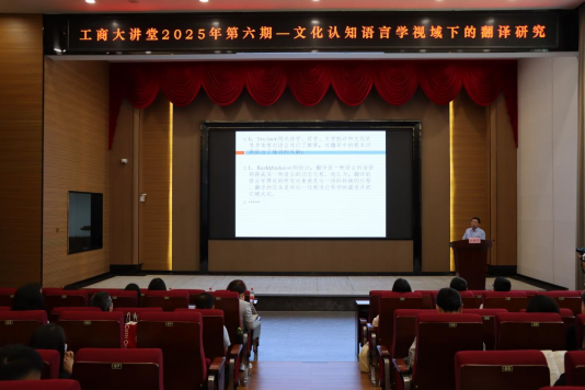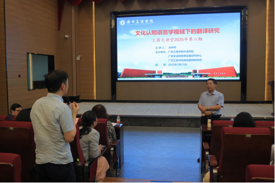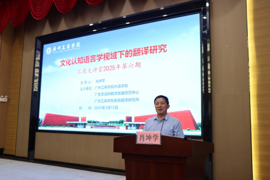 【本网讯】5月15日,工商大讲堂2025年第六期学术讲座在beat365在线体育官网登录入口花都校区隆重举办。本次讲座由外语学院、广东多语种教育发展研究中心以及beat365在线体育官网登录入口商务翻译研究所联合主办,本次讲座由广州大学肖坤学教授担任主讲嘉宾。讲座的主题为《文化认知语言学视域下的翻译研究》。外语学院商务英语专业负责人周正秀副教授主持活动,逾百名教师参与了讲座。