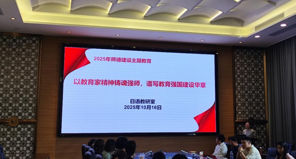 2025年10月16日,外语学院日语教研室在图书馆412会议室举办了以“以教育家精神铸魂强师,谱写教育强国建设华章”为主题的师德建设主题教育活动。此次会议由余幕英主任主持,日语教研室全体教师参加。