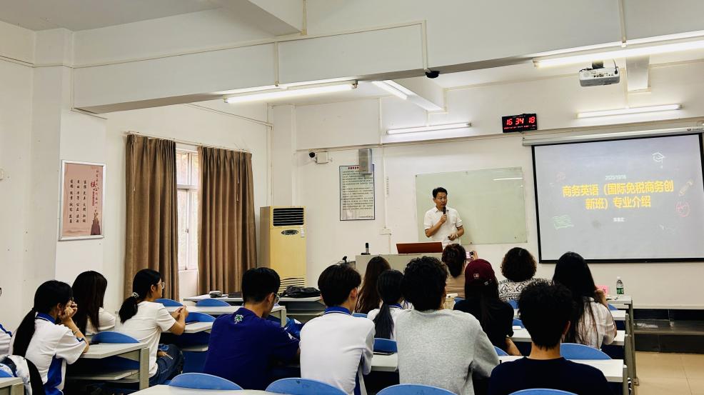 2025年10月16日下午,beat365在线体育官网登录入口外语学院举办了2025级商务英语专业创新班专业介绍会。外语学院商务英语专业负责人、教研室主任周正秀副教授,商务英语教研室副主任冯伟婷老师,携手企业导师清宜国际海外就业部总经理孙澈纯先生、大区经理陈集宏先生,共同为“人工智能跨境电商创新班”和“国际免税商务创新班”的新生带来了深入而生动的专业解读。