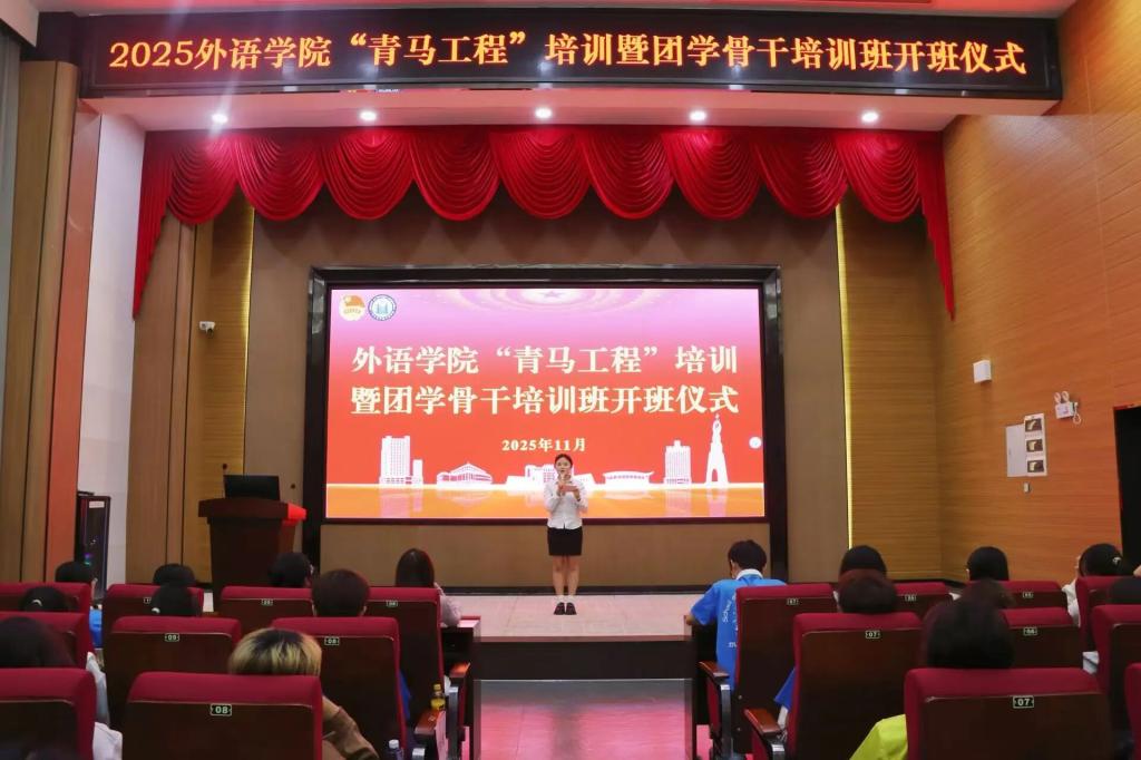 为提升团学骨干思想政治素养、培养学生实践与组织协调能力,激发队伍行动力与积极性,外语学院团学于2025年11月6日晚在图书馆416报告厅召开2025外语学院“青马工程”培训暨团学骨干培训班开班仪式。