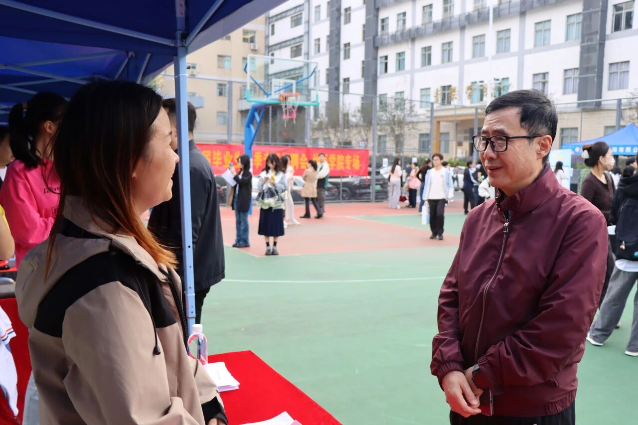 外语学院高度重视毕业生就业工作。外语学院院长刘沛富教授、招就办副主任黄秉森,外语学院副院长邢佳平、高亮等领导亲临招聘会现场,开展指导与交流工作。期间,领导们认真听取招聘负责人关于岗位详情、用人标准及人才需求的介绍,同时细致记录企业反馈意见与应聘学生的就业期望,为进一步优化就业服务、搭建校企合作桥梁奠定基础。