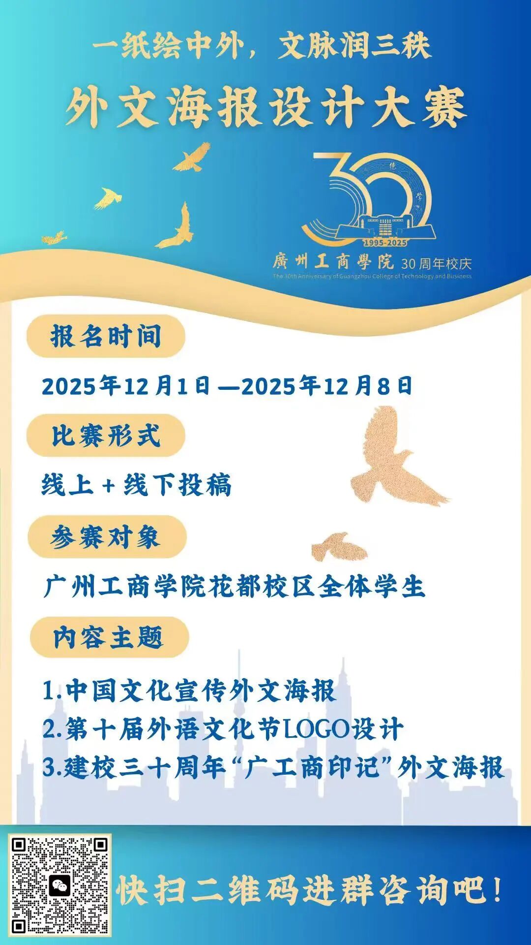 参赛者或参赛队伍需紧扣 “广工商印记”作外文海报,可选校园建筑、校徽、校训等特色内容,传递校园情怀,凸显学校三十载特质