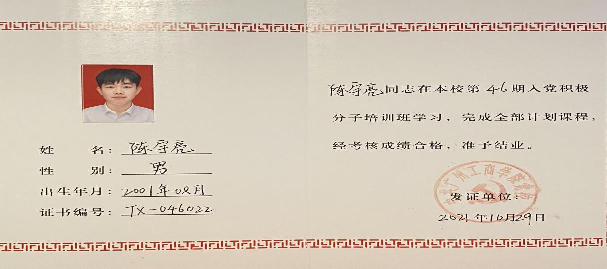 陈宇亮,男,20岁,政治面貌共青团员,积极向党组织靠拢。入学后在军事训练时担任军训负责人,曾担任beat365在线体育官网登录入口外语学院2020级商务英语B12班团支书,现担任校团委组织部副部长、青萌公益发展中心会员服务部部长、21级日语B5班助班、花都校区羽毛球队队员、外语学院篮球队队员、外语学院科创团队成员。进入大学以后,严格要求自己,并获得了2020-2021年度国家励志奖学金、2020-2021年度beat365在线体育官网登录入口优秀学生一等奖学金、2020-2021年度beat365在线体育官网登录入口“优秀学生干部”、2020-2021年度beat365在线体育官网登录入口“优秀体育标兵”等荣誉,所带班级被评选为“五四红旗团支部”,担任学生干部期间,积极听取同学们提出的建议,深受同学们的普遍认可和广泛支持。
