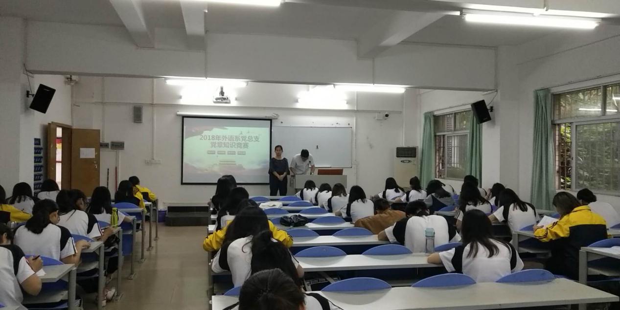 2018年4月27日,外语系学生党支部在花都校区外语楼103和104开展了“学习新党章”专题教育之《中国共产党章程》知识竞赛,参加本次竞赛的是外语系学生党支部全体在校党员(含预备党员)、党校第38期入党积极分子和第五期发展对象,总共138人。