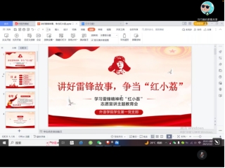 为深入学习领会习近平总书记重要指示精神,传承雷锋精神。外语学院学生第一党支部于2023年3月23日下午组织开展线上专题学习会,支部全体党员到会,会议由支部宣传委员冯巧娟同志主持领学。