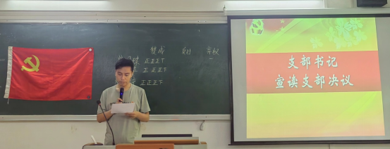 随后,外语学院学生第四党支部书记董理政同志宣读支部决议,他表示曾明珠、周小华、郑晓婷基本符合党员条件,同意接收其为预备党员。
