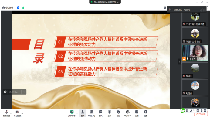 2024年11月28日晚,外语学院教工第一支部书记周正秀同志通过腾讯会议召开了“铸魂:精神谱系宣讲”的主题党会,本次会议旨在带领支部教师党员深入学习和宣传中国共产党人的精神谱系,进一步坚定中国共产党人的理想信念。本次会议通过理论宣讲、生动的视频及案例分享,激励教师党员在新时代的伟大实践中传承红色基因,弘扬中国共产党人的优良传统,激发我支部教师党员的奋斗热情。