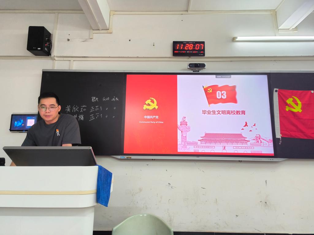 首先苏伟豪书记通过《习近平著作选读》第一卷、第二卷选文教育毕业生党员要想实现梦想,必须要实干,要不断学习,强化责任意识,为国家的发展贡献自己的力量。接着书记带领全体毕业生党员重温入党誓词,再学党章知识和党员义务,重温入党初心,强化责任担当意识。然后书记教育毕业生党员要文明离校。