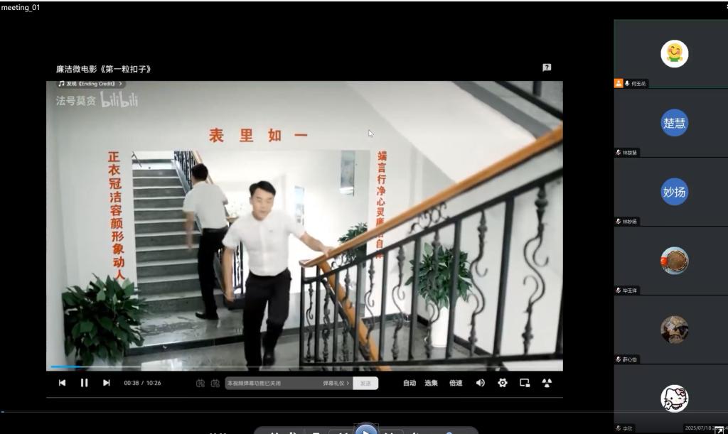 为深入学习贯彻习近平总书记重要讲话和重要指示批示精神,坚决落实中央八项规定及其实施细则精神,2025年7月18日,外语学院学生第三党支部线上组织全体师生党员一起观看了《扣好人生第一粒扣子》警示教育片,以鲜活案例为教材,为全体师生党员敲响廉洁自律的警钟。