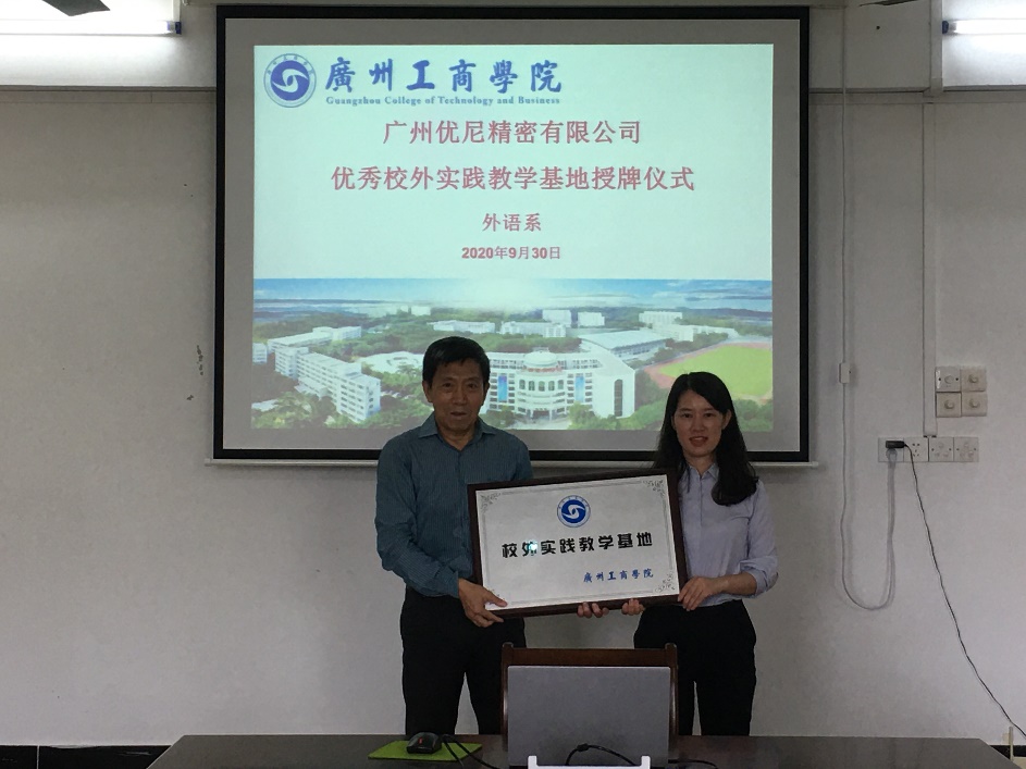 2020年9月30日下午,广州优尼精密有限公司与beat365在线体育官网登录入口校企合作授牌仪式在beat365在线体育官网登录入口外语系举行。外语系主任高凤江教授、副主任邢佳平、办公室主任陈钧议老师以及广州优尼精密有限公司人事科和培训科专员出席了本次活动。